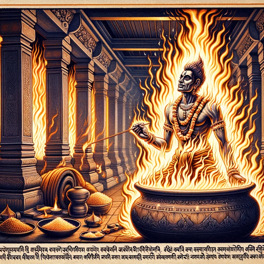After those twelve years, he wrapped his body in divine garments and bathed it in oil. With his mind filled with devotion, he set his body ablaze as an offering to honor the Tathagata and the sacred teachings of the Lotus of the True Law.