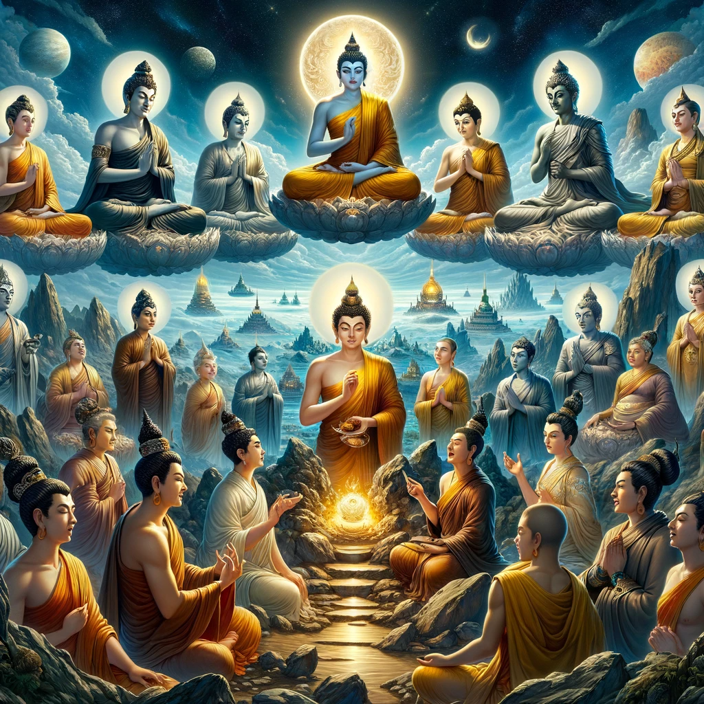 Instantly, Understanding-the-Essence-of-the-Star’s-Radiance, One-who-Views-All-Beings-with-Love rose high into the sky, sitting cross-legged atop a magnificent tower of seven precious substances. In this way, he journeyed to the presence of the Enlightened One and, with great respect, bowed to him, circled him seven times, raised his hands in homage, and recited the following verses: