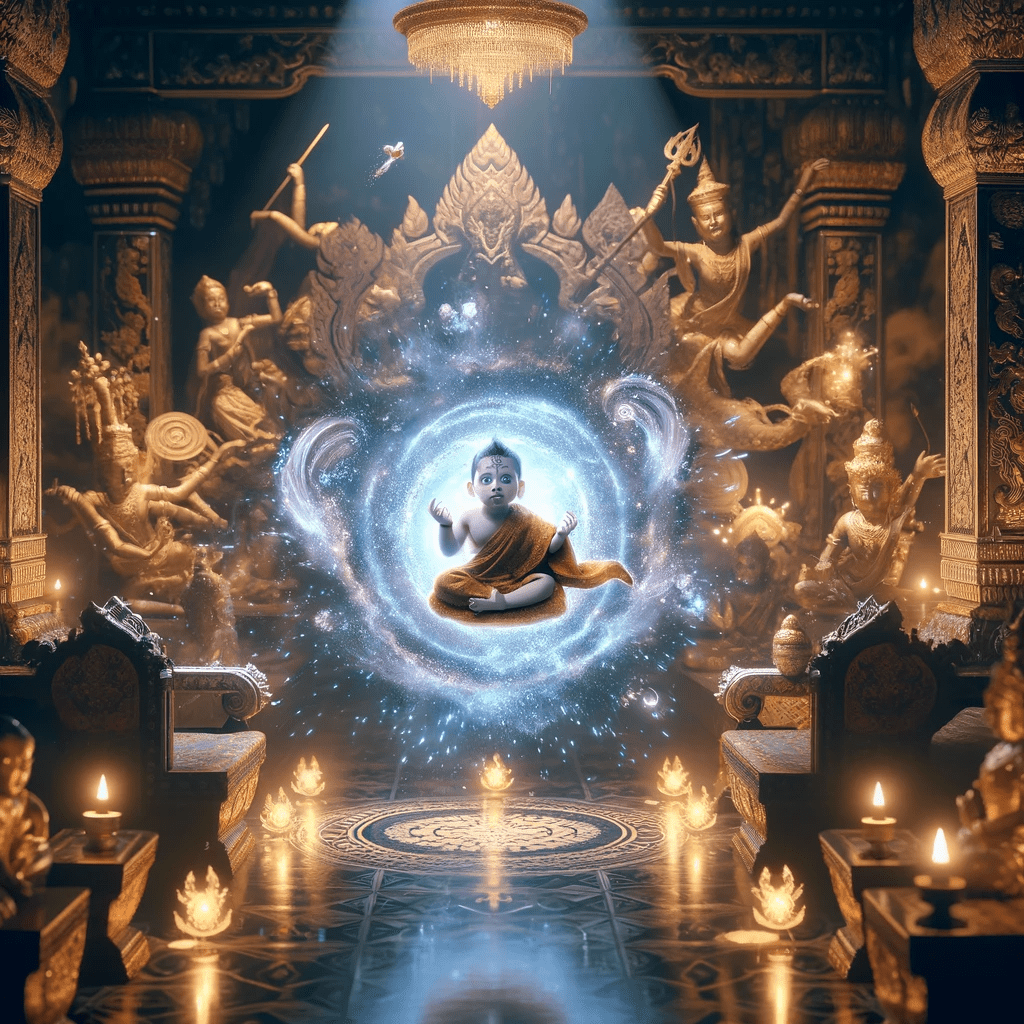 He reappeared under the spiritual reign of that very Lord, Radiance-of-the-Moon’s-Pure-Light, the Enlightened One, in the house of King Vimaladatta (Immaculate Gift), by miraculous birth, and sitting cross-legged. Immediately after appearing, One-who-Views-All-Beings-with-Love addressed his father and mother in the following verses: