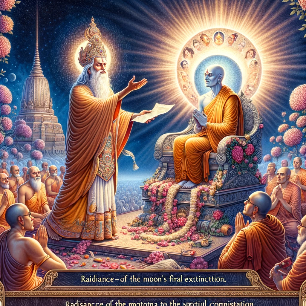 And, Understanding-the-Essence-of-the-Star’s-Radiance, after Radiance-of-the-Moon’s-Pure-Light, the Tathagata, had given these instructions to One-who-Views-All-Beings-with-Love, he, in the last watch of the night, entered absolute final extinction.