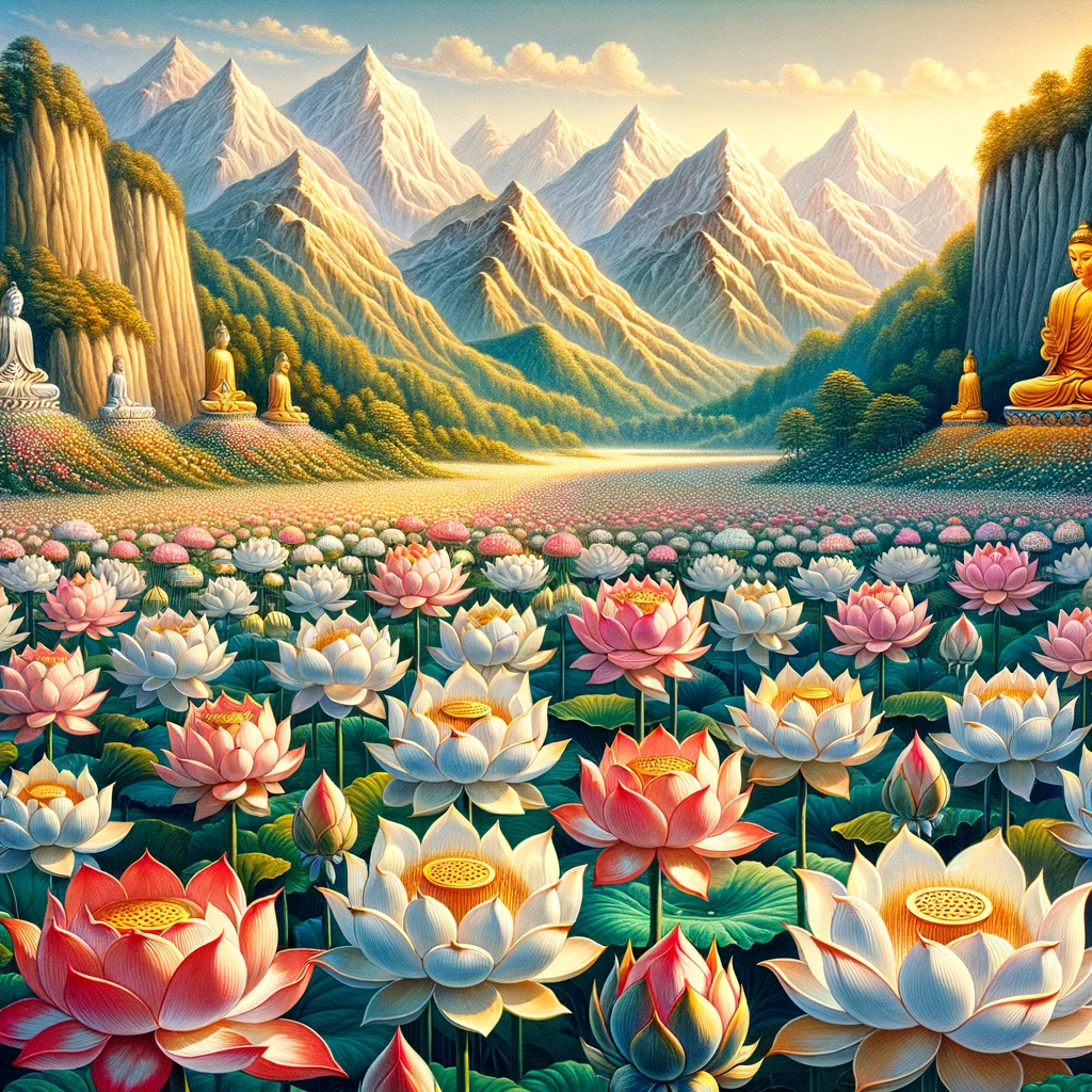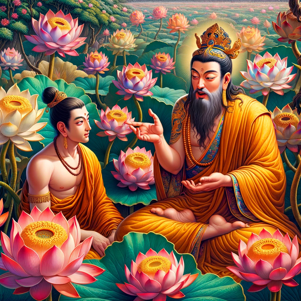 As this stunning array of lotuses appeared, Manjusri, a prince among enlightened beings, asked Lord Buddha Sakyamuni: “O Great One, who has created these magnificent lotuses with golden stalks, silver leaves, and blossoms as vibrant as rosy lotuses and Butea Frondosa? What is the cause of this extraordinary sight?”