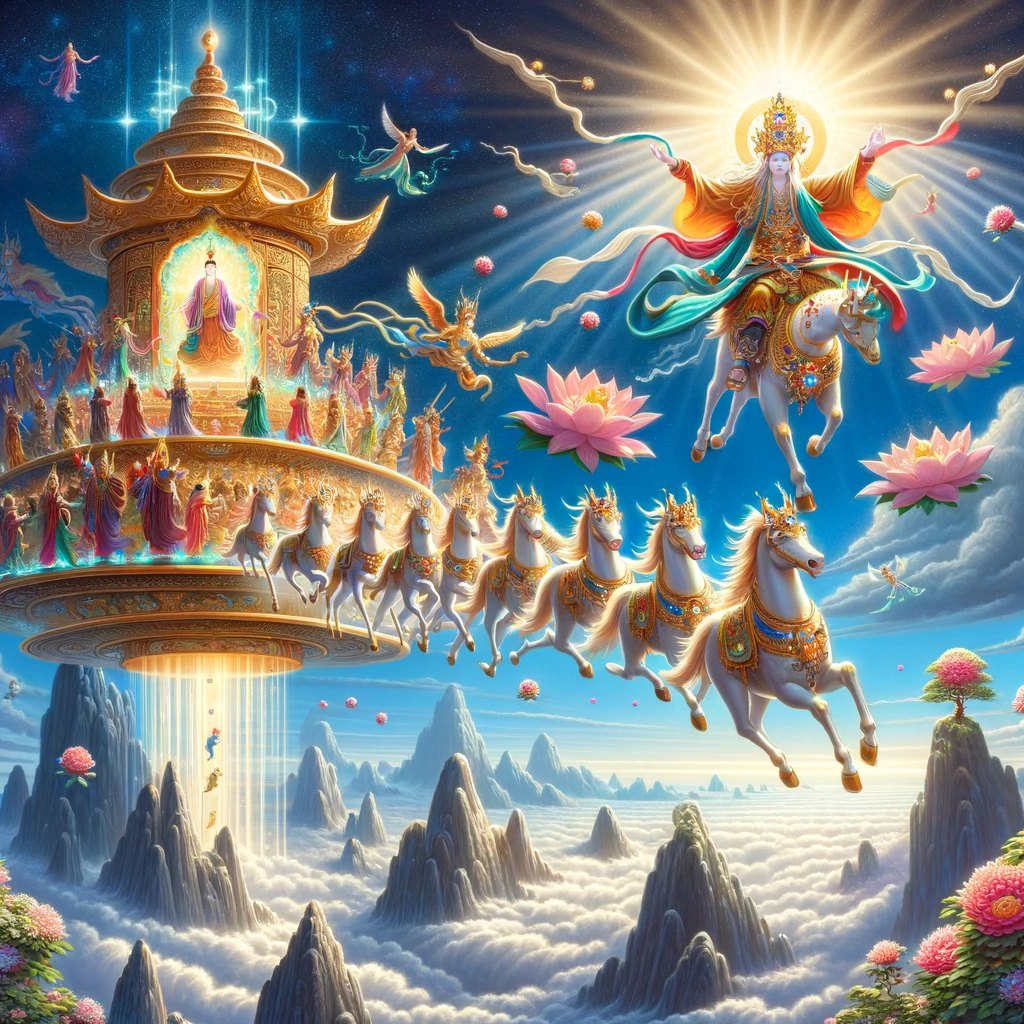 Riding a tower of precious gems, he floated through the sky, accompanied by a host of enlightened beings. Upon reaching the sacred mountain, he descended from his tower, his body radiating a divine aura.