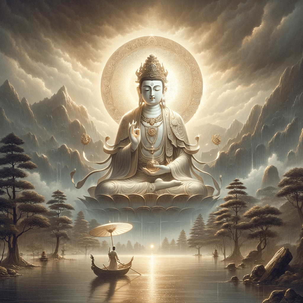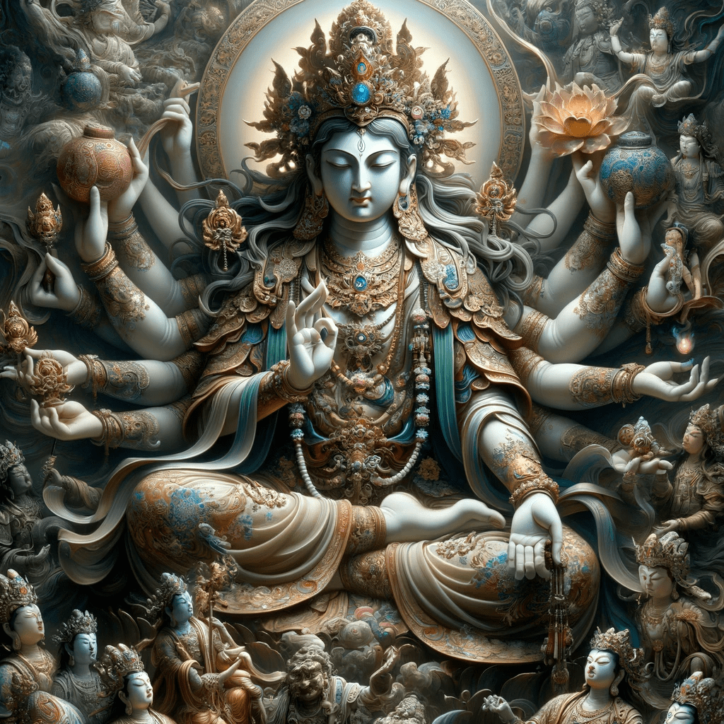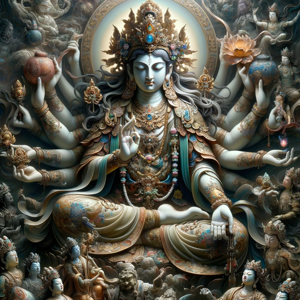 Then, the noble Bodhisattva Dharanindhara (meaning “Supporter of the Earth”) rose from his seat, draped his robe over one shoulder, knelt on his right knee, and stretched his hands in respect towards the Lord. He said, “Those who hear this chapter about the noble Bodhisattva Avalokitesvara, and this remarkable ability to transform, must indeed be filled with a deep reservoir of goodness, O Lord.”