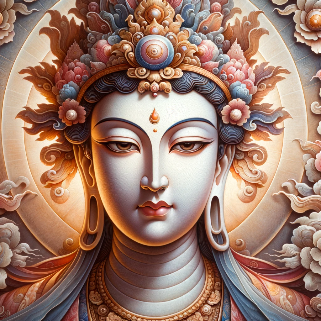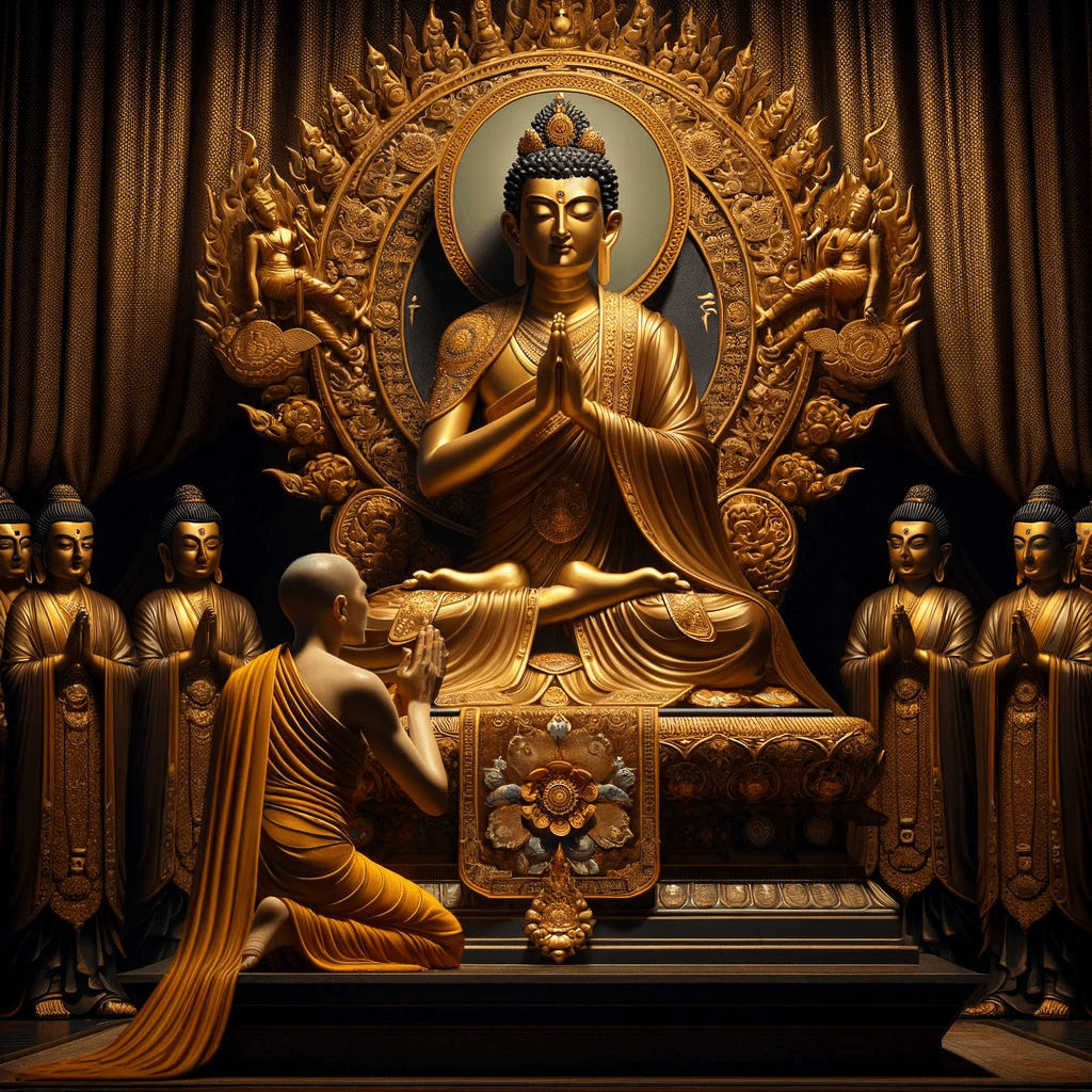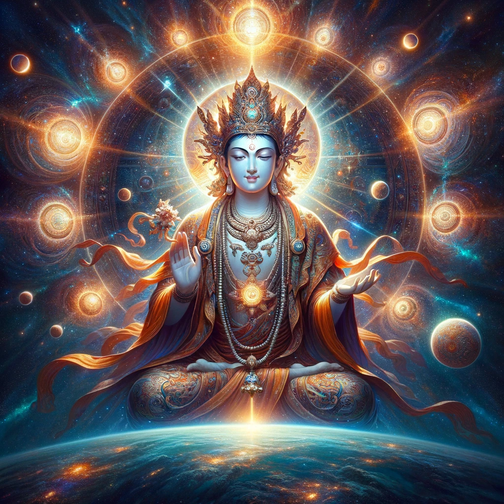 Then, the noble Bodhisattva Dharanindhara (meaning “Supporter of the Earth”) rose from his seat, draped his robe over one shoulder, knelt on his right knee, and stretched his hands in respect towards the Lord. He said, “Those who hear this chapter about the noble Bodhisattva Avalokitesvara, and this remarkable ability to transform, must indeed be filled with a deep reservoir of goodness, O Lord.”