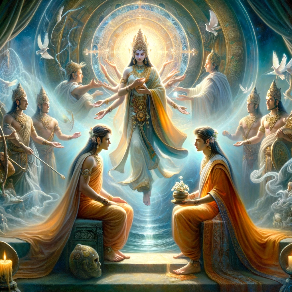 After their celestial performance, the young princes Vimalagarbha and Vimalanetra descended from the sky and went to their mother. Hands clasped together, they said, “Mom, we’ve opened our father’s eyes to higher wisdom. We’ve been his spiritual guides. Now it’s time for us to fully embrace our spiritual calling in the presence of the Enlightened One.”